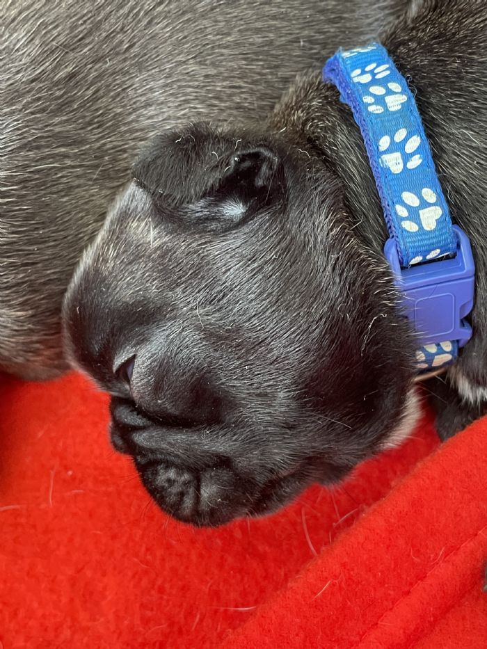 Brindle male above vaccinated, micochip and parentage tested. Uses the doggie door freely.